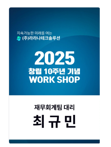다음은 기업의 중요한 마일스톤인 창립 10주년 기념 워크숍 명찰입니다. 기업 행사는 브랜드 컬러와 로고가 명확히 드러나야 소속감을 고취시킬 수 있습니다.