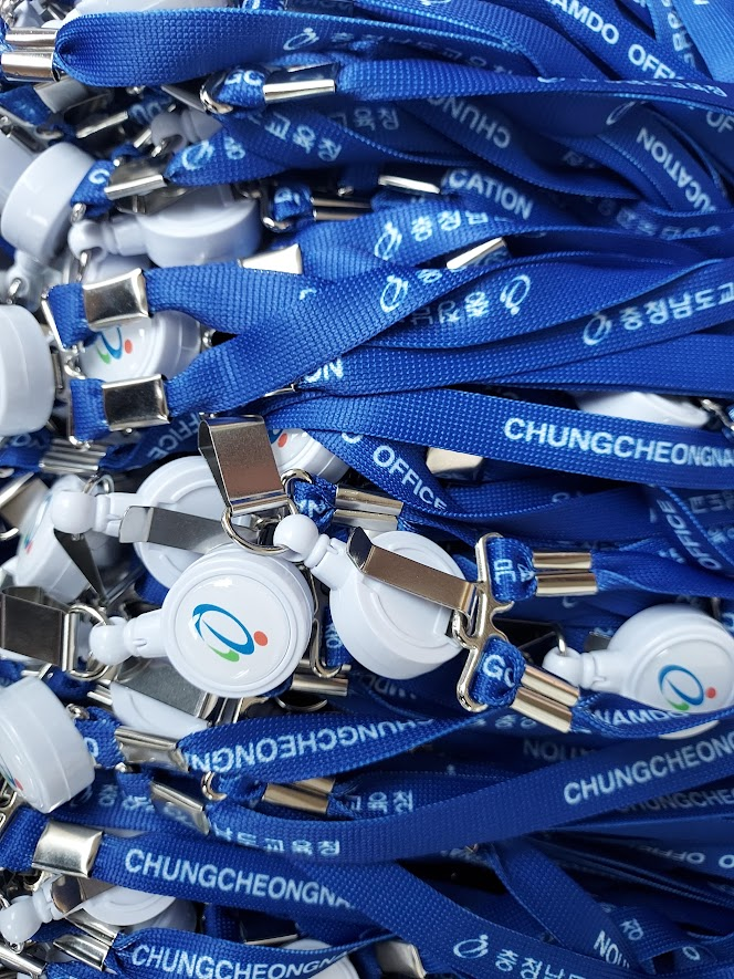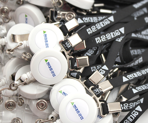 저가형 비닐 명찰 대신, 학교와 기업의 로고가 선명하게 인쇄된 **고급 랜야드(목걸이 줄)**와 릴홀더를 지급해 보세요.