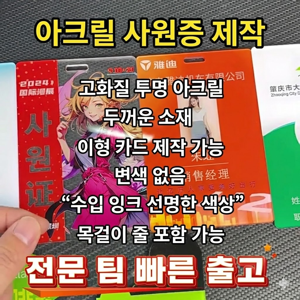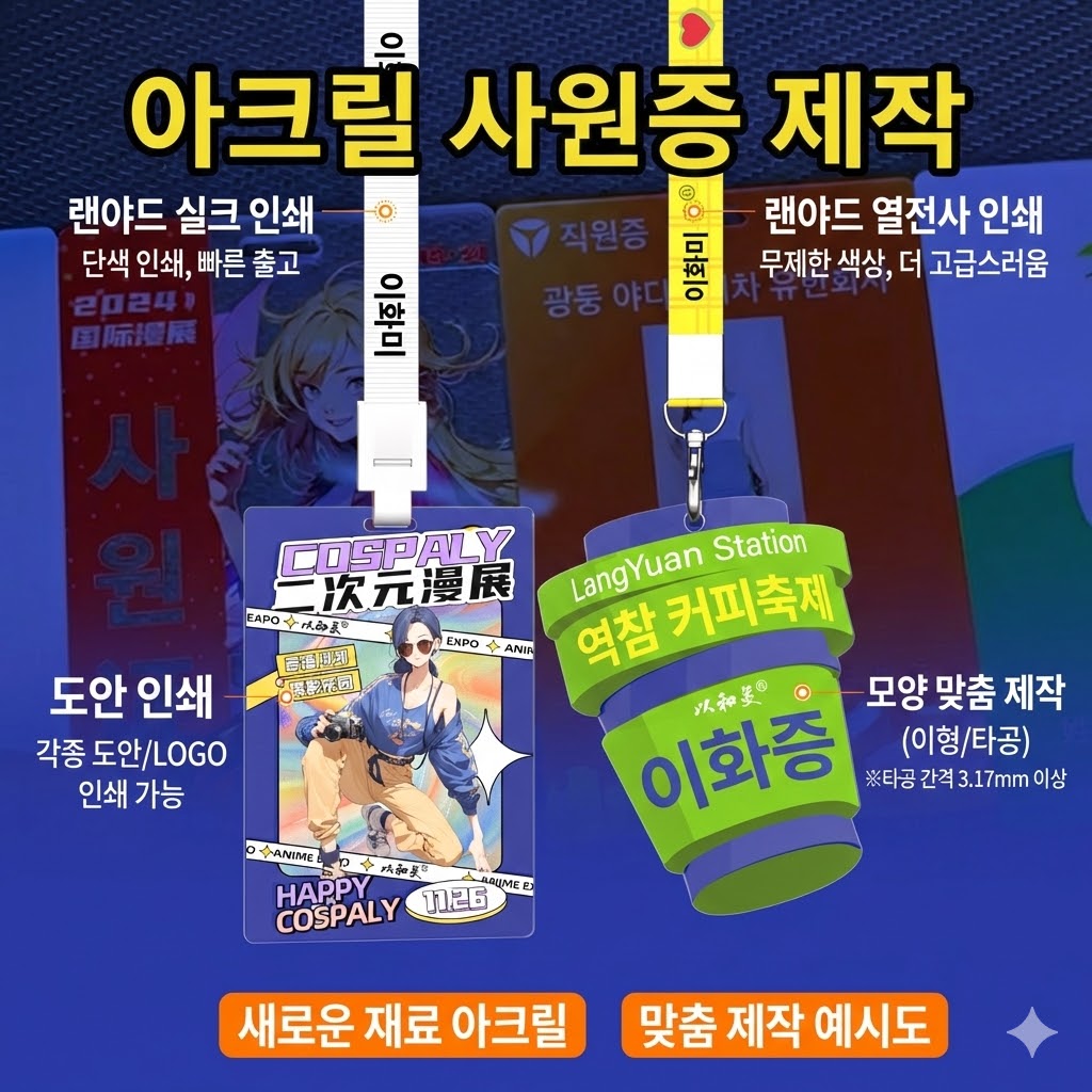 회사의 첫인상을 결정짓는 사원증이나 대규모 행사의 얼굴이 되는 명찰, 아무곳에나 맡길 수 없죠? 오늘은 15년 업력을 자랑하는 3,000㎡ 규모의 슈퍼 팩토리에서 제작되는 프리미엄 아크릴 사원증 제작 프로세스와 특장점을 완벽 정리해 드립니다.
