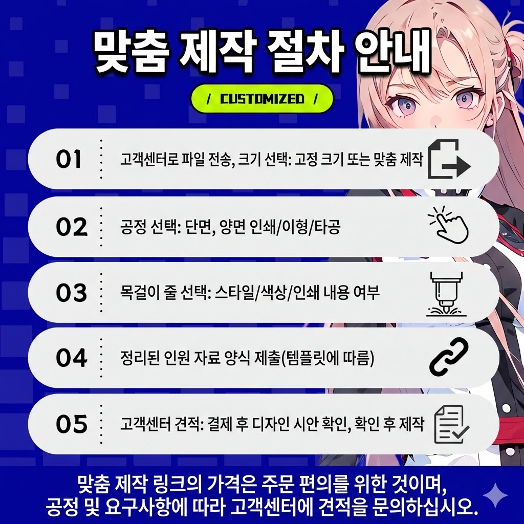 - 상담 및 사이즈 확정: 고객센터로 파일을 전송하고 고정 규격 또는 맞춤 사이즈를 선택합니다.