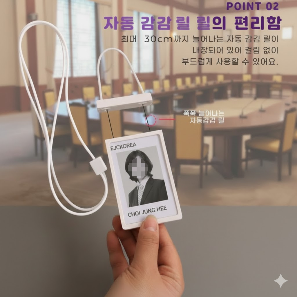 - POINT 02. 자동 감김 릴의 편리함: 최대 30cm까지 늘어나는 자동 감김 릴이 내장되어 있어, 출입 카드 태그 시 허리를 숙일 필요 없이 부드럽게 사용 가능합니다.